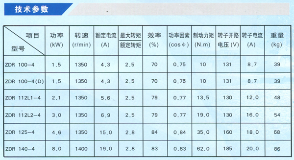 ZDR系列錐形繞線轉(zhuǎn)子三相異步電動機(jī),可串接電阻起動,使其機(jī)械特性能人為隨意變軟,能在較小的起動電流下提供較大的起動轉(zhuǎn)矩;可進(jìn)行小士圍調(diào)速。它起動平穩(wěn),制動安全,且能與減速機(jī)配套,用于驅(qū)動起重機(jī)械及**率機(jī)械和其它需要制動平緩的傳動機(jī)械。 ZDR系列電動機(jī)采用380V電源,50Hz,基本工作制為S4,負(fù)載持續(xù)率25%,等效起動次數(shù)120次/小時。 ZDR系列電動機(jī)為封閉式結(jié)構(gòu),防護(hù)等級為IP44,冷卻方式為自冷式IC0141,絕緣等級有B級和F級兩